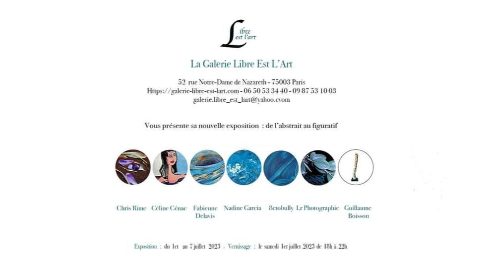Exposition du 1er au 7 juillet à : (thème de l’abstrait au figuratif) La Galerie Libre Est l’Art 52 rue Notre Dame de Nazareth 75003 Paris, qui se tiendra du 1er au 7 juillet